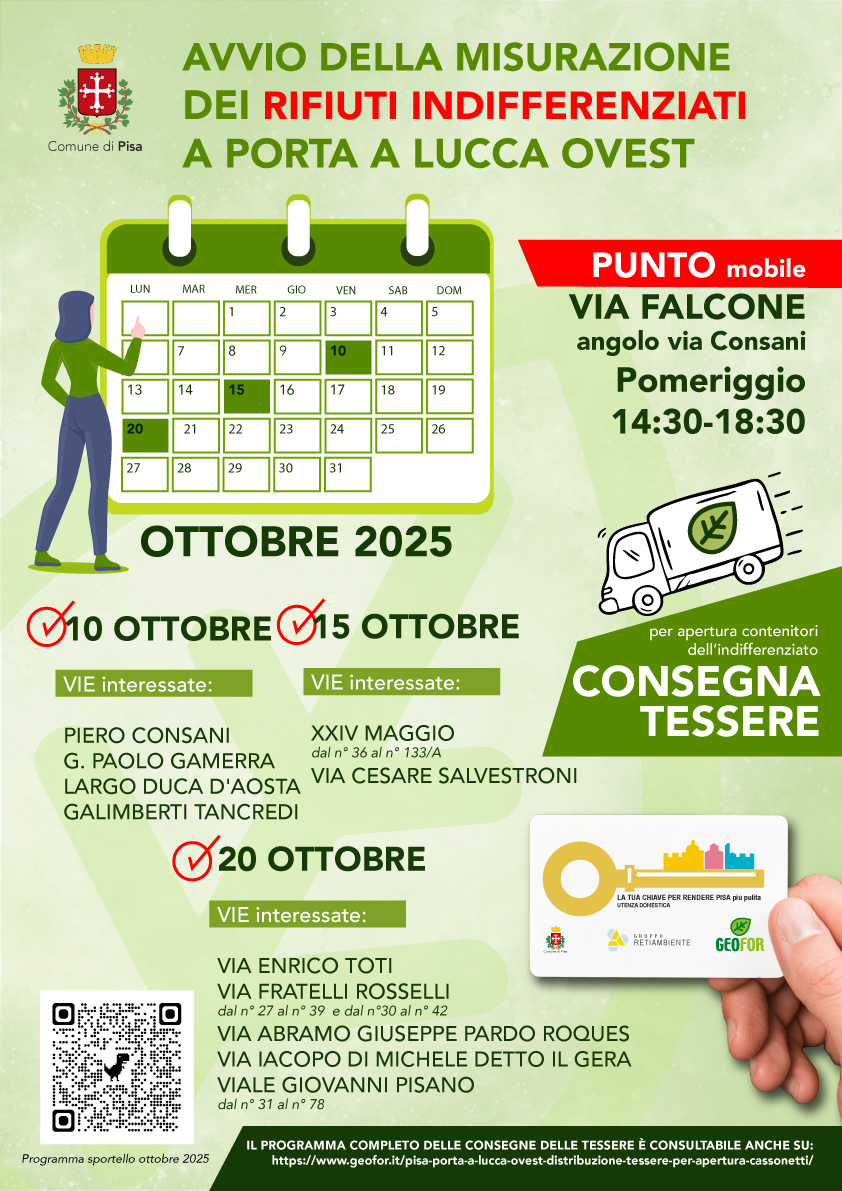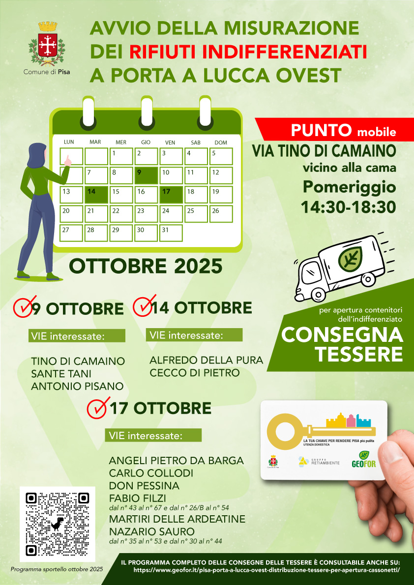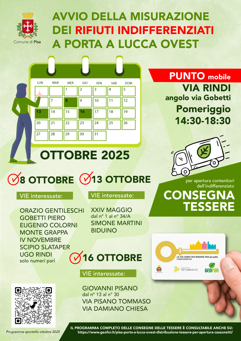 Il Comune di Pisa e Geofor invitano tutti gli utenti delle vie indicate nel calendario a presentarsi nelle date corrispondenti per il ritiro della tessera elettronica.